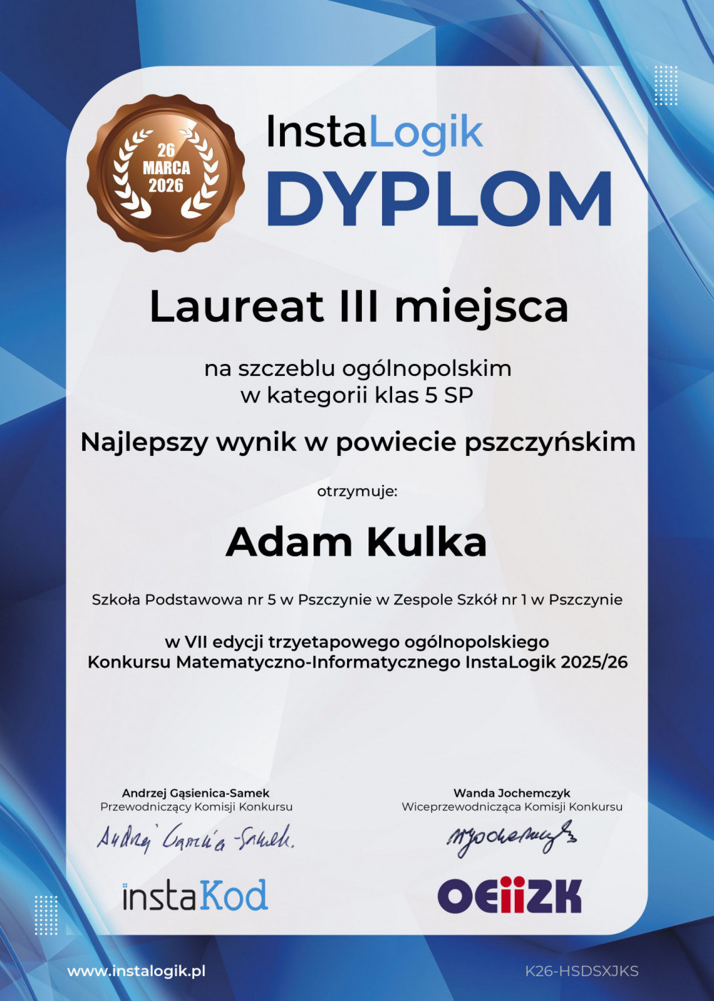 W tym roku po raz drugi nasza Szkoła Podstawowa wzięła udział w Ogólnopolskim Konkursie InstaLogik. Szkołę reprezentowało dwoje uczniów, a ich udział zakończył się ogromnym sukcesem – obaj wykazali się wytrwałością i pasją w dążeniu do celu!